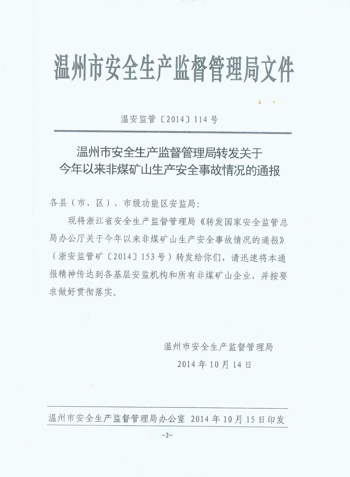 現將蒼南縣安全生產監督管理局《轉發關于今年以來非煤礦山生產安全事故情況的通報》(蒼安監[2014]55號)轉發給你們,請按要求做好貫徹落實。