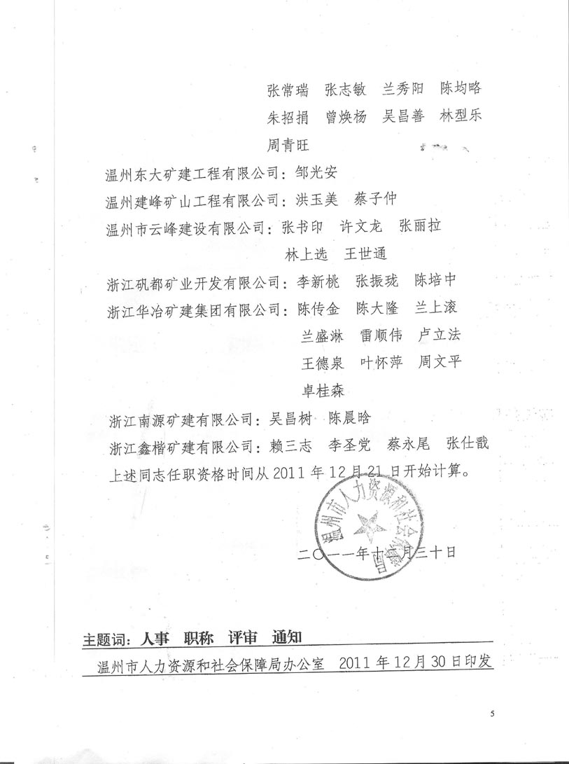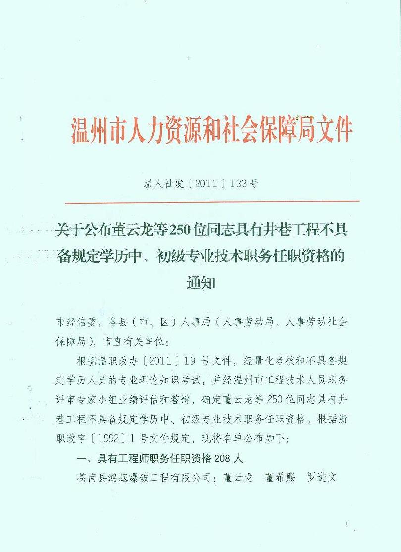 關(guān)于公布董云龍等250位同志具有井巷工程不具備規(guī)定學(xué)歷中、初級(jí)專業(yè)技術(shù)職務(wù)任職資格的通知